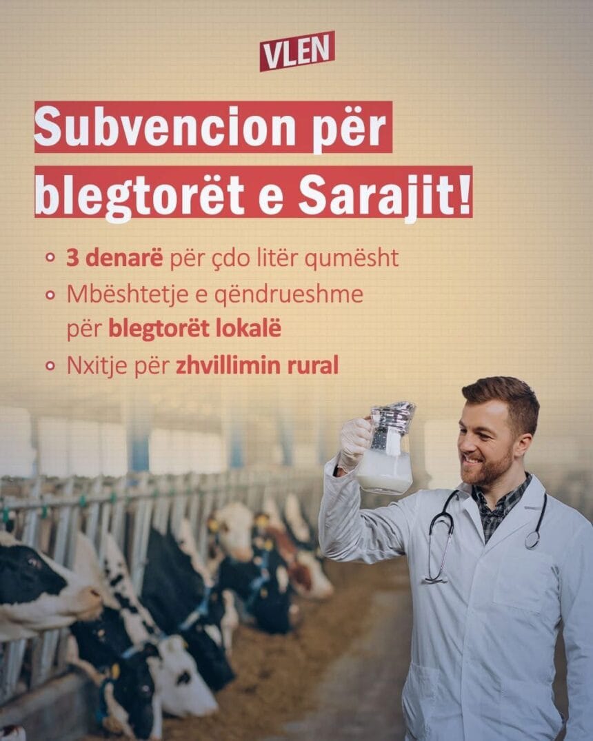 Kandidati i koalicionit VLEN për komunën e Sarajit, Muhamed Elmazi, ka prezantuar një masë konkrete mbështetëse për blegtorët lokalë. Ai ka bërë të ditur se komuna do të ndajë subvencion prej 3 denarë për çdo litër qumësht për prodhuesit vendorë që merren me ruajtjen e lopëve mjellëse.