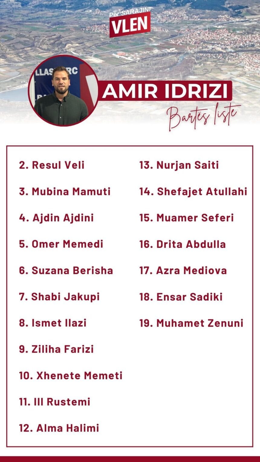 “Elmazi theksoi se në listë janë të përfaqësuara pothuajse të gjitha vendbanimet e Sarajit, si dhe shtresat shoqërore e profesionet që i japin komunës dinamikën e saj. Ai shtoi se me këtë ekip të përkushtuar, VLEN hyn në zgjedhje për të ofruar transparencë, zhvillim dhe mirëqenie për qytetarët.