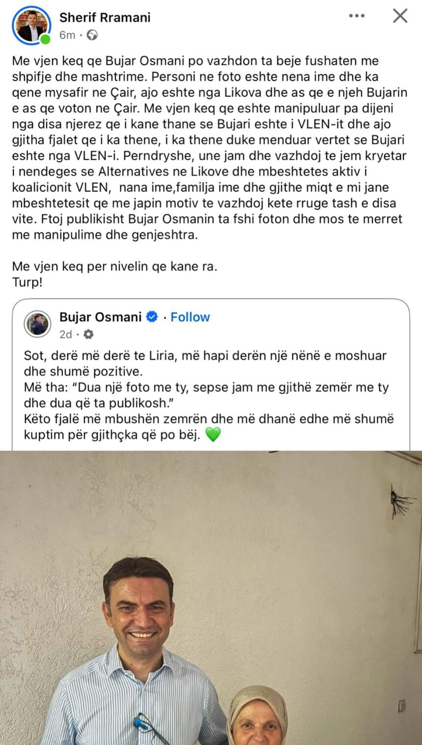 Sherif Rrahmani ka reaguar ashpër ndaj një postimi të Bujar Osmanit, duke e akuzuar atë për keqpërdorim dhe manipulim në kuadër të fushatës zgjedhore.